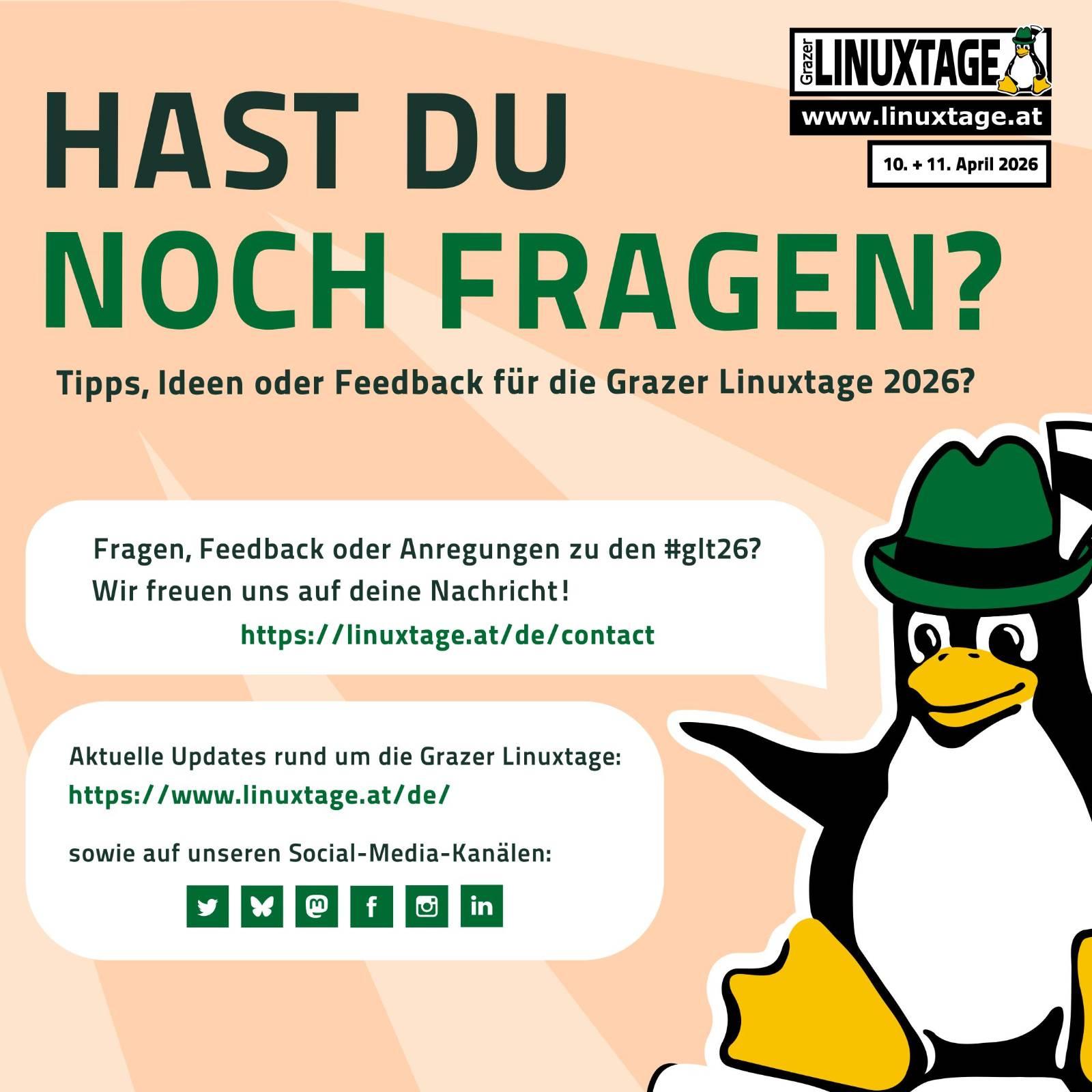 Findet uns auch auf X, Bluesky, Facebook und LinkedIn für aktuelle Updates rund um die Grazer Linuxtage: