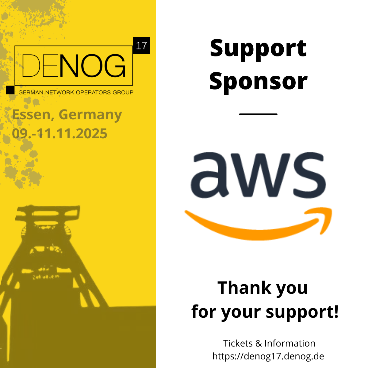 Huge thanks to AWS for being a Support sponsor of #DENOG17! We’re thrilled to have you with us for an incredible conference. Learn more at https://denog17.denog.de