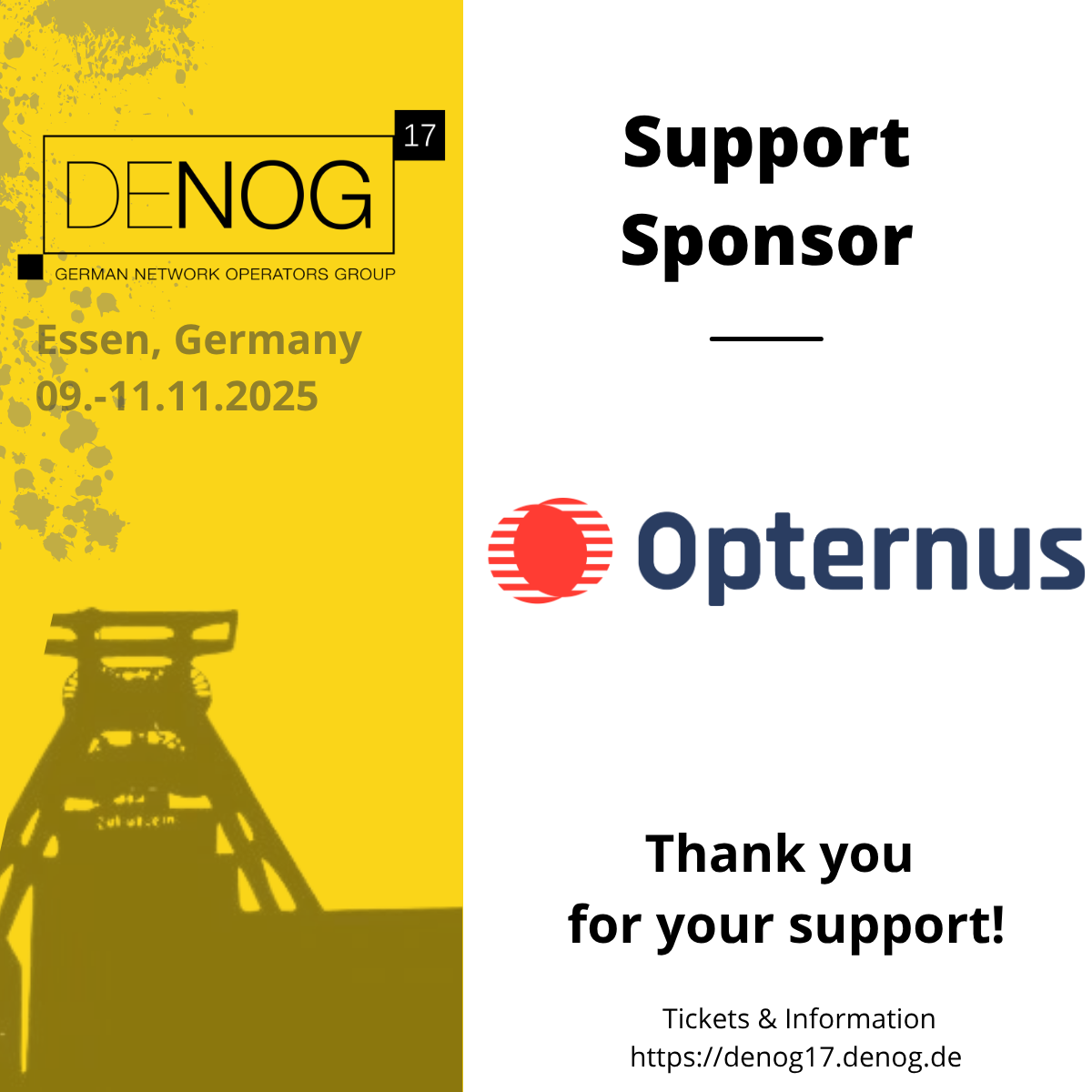 A big thank you to Opternus for being a Support sponsor of #DENOG17! We’re excited to have you on board for an amazing conference. Check out all the details at https://denog17.denog.de.